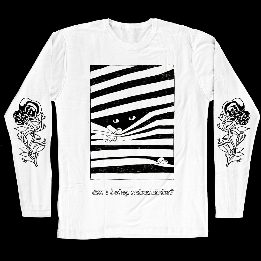 jas hice presents: 100% cotton comfort colors white long sleeve with black print on front and sleeves. adorned with a panel from the ignatz-nominated minicomic "szarlotka" published by frog farm. are you being misandrist? printed by xlvacx